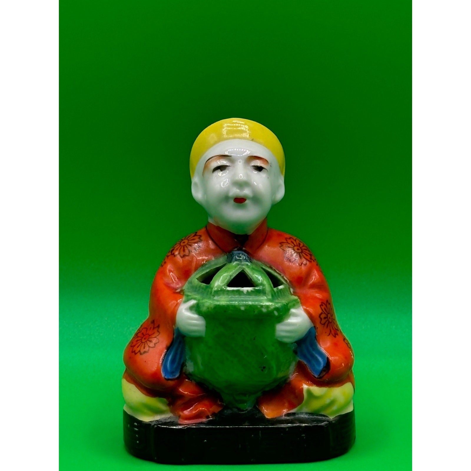 VTG Chinese Porcelain Incense Holder - Colorful Man with Green Basket - 3.25" Tall