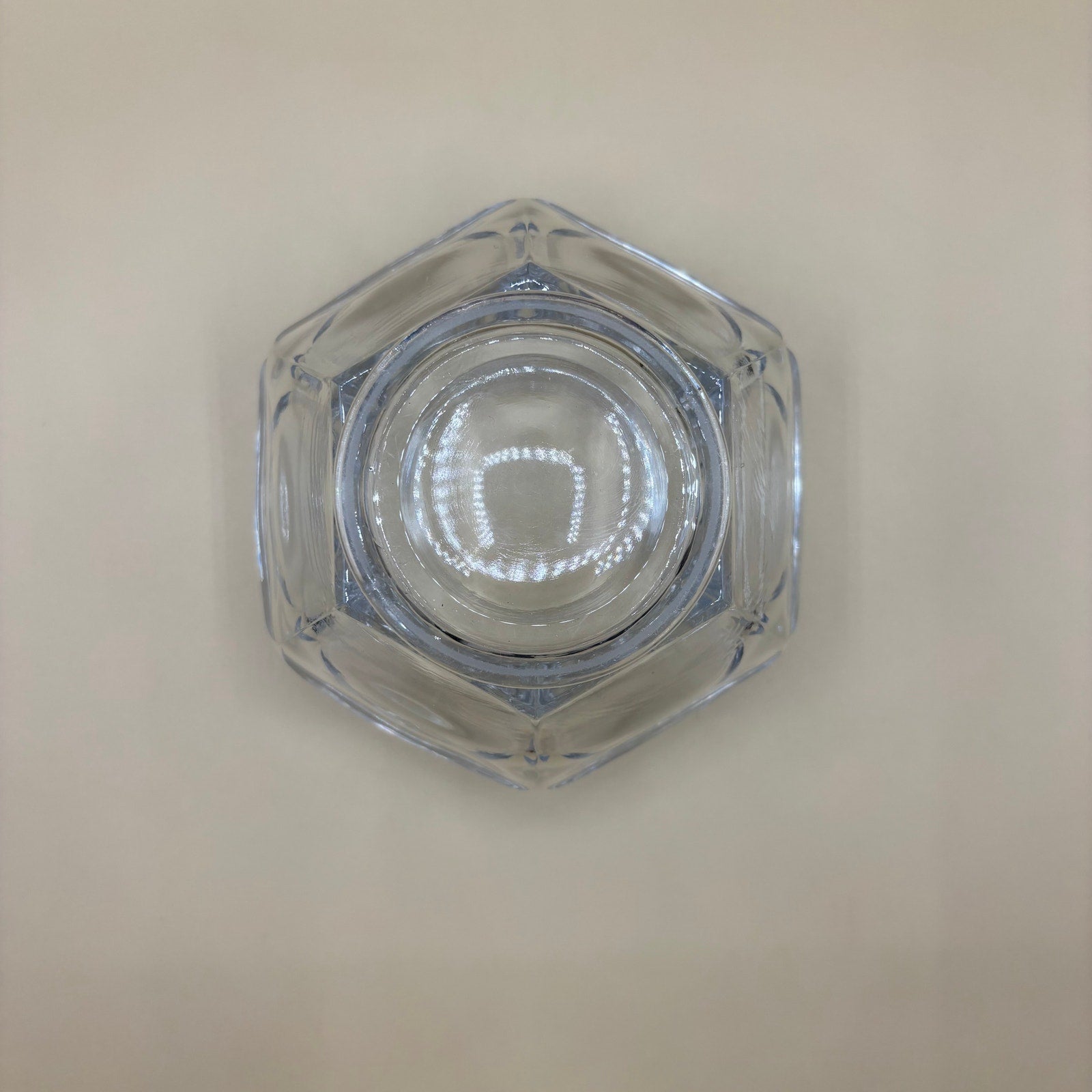 This is a neat looking Vintage pressed glass bowl featuring faceted geometric design. Heavy clear glass with clean lines. Perfect for candy, nuts, or decorative use.