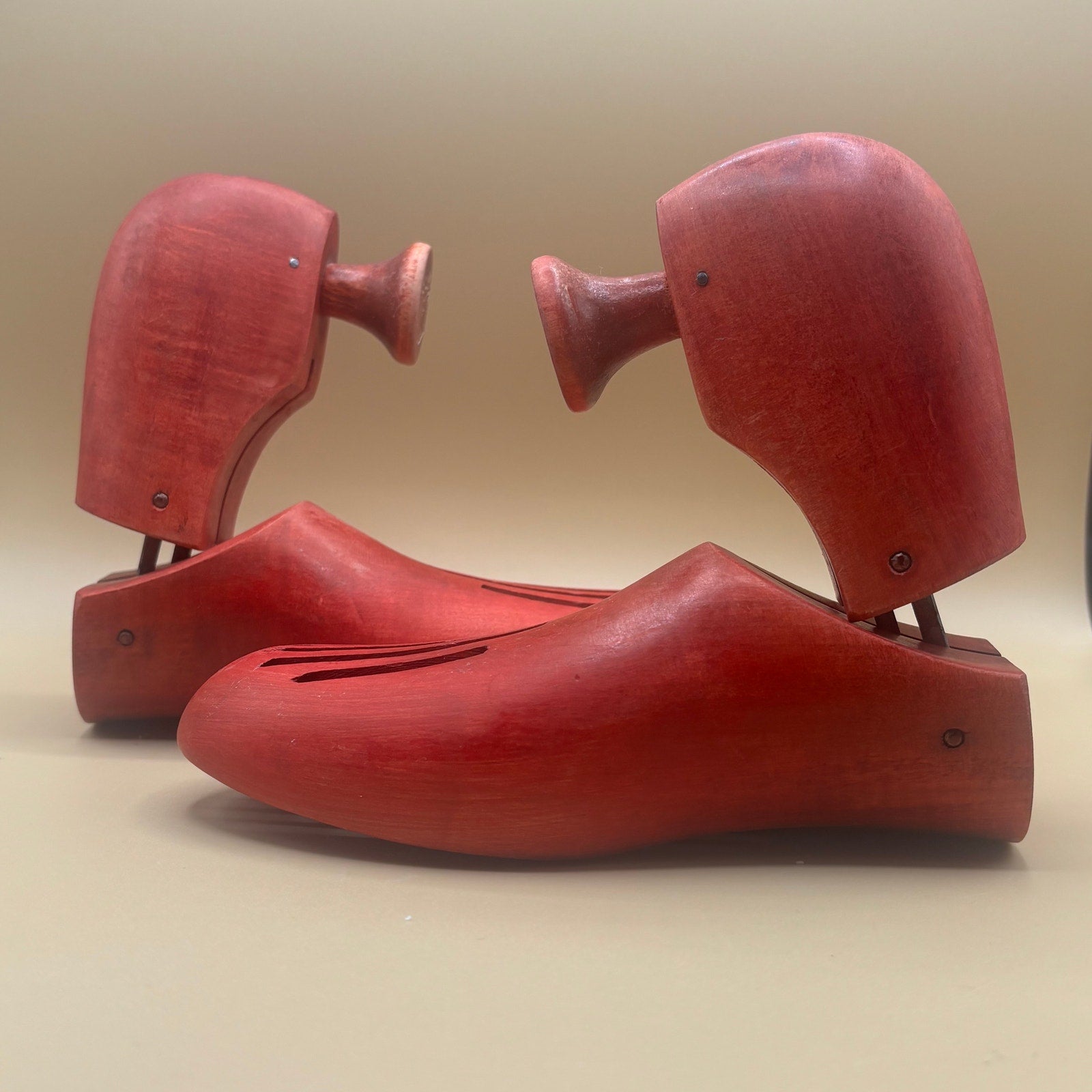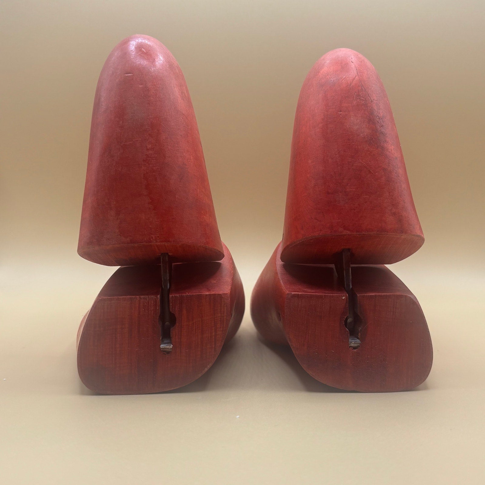 Vintage Florsheim wooden shoe stretchers featuring the classic F crown hallmark on knobs. Beautiful red-stained wood with ventilation slots. Perfect for display as bookends, vintage shop decor, or collectible shoe memorabilia. Features Florsheim's signature craftsmanship from their heritage of quality shoemaking.