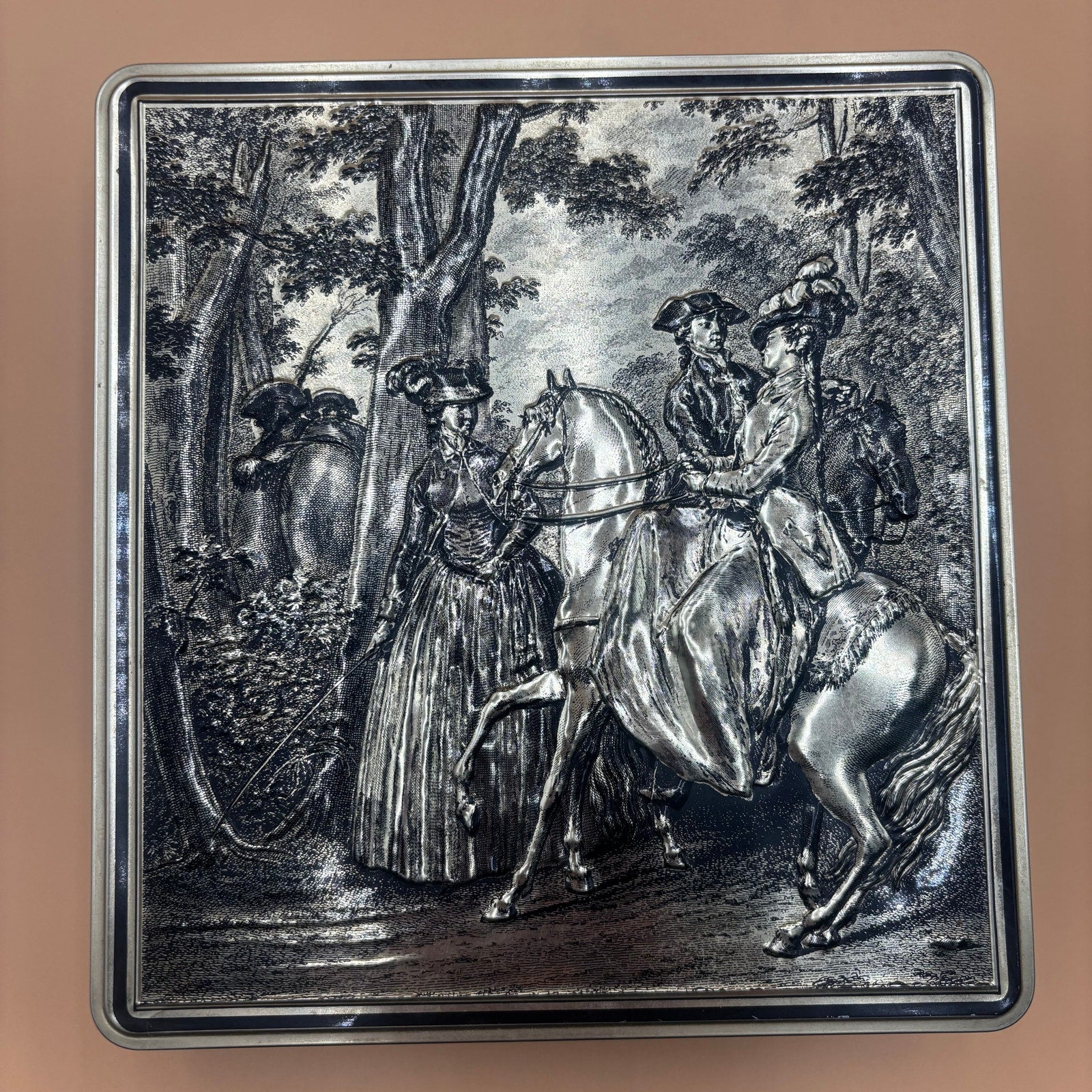 Vintage French-style tin box featuring embossed Victorian scene with figures on horseback. Gold-toned finish with detailed relief artwork. Perfect for display or storage of small treasures.