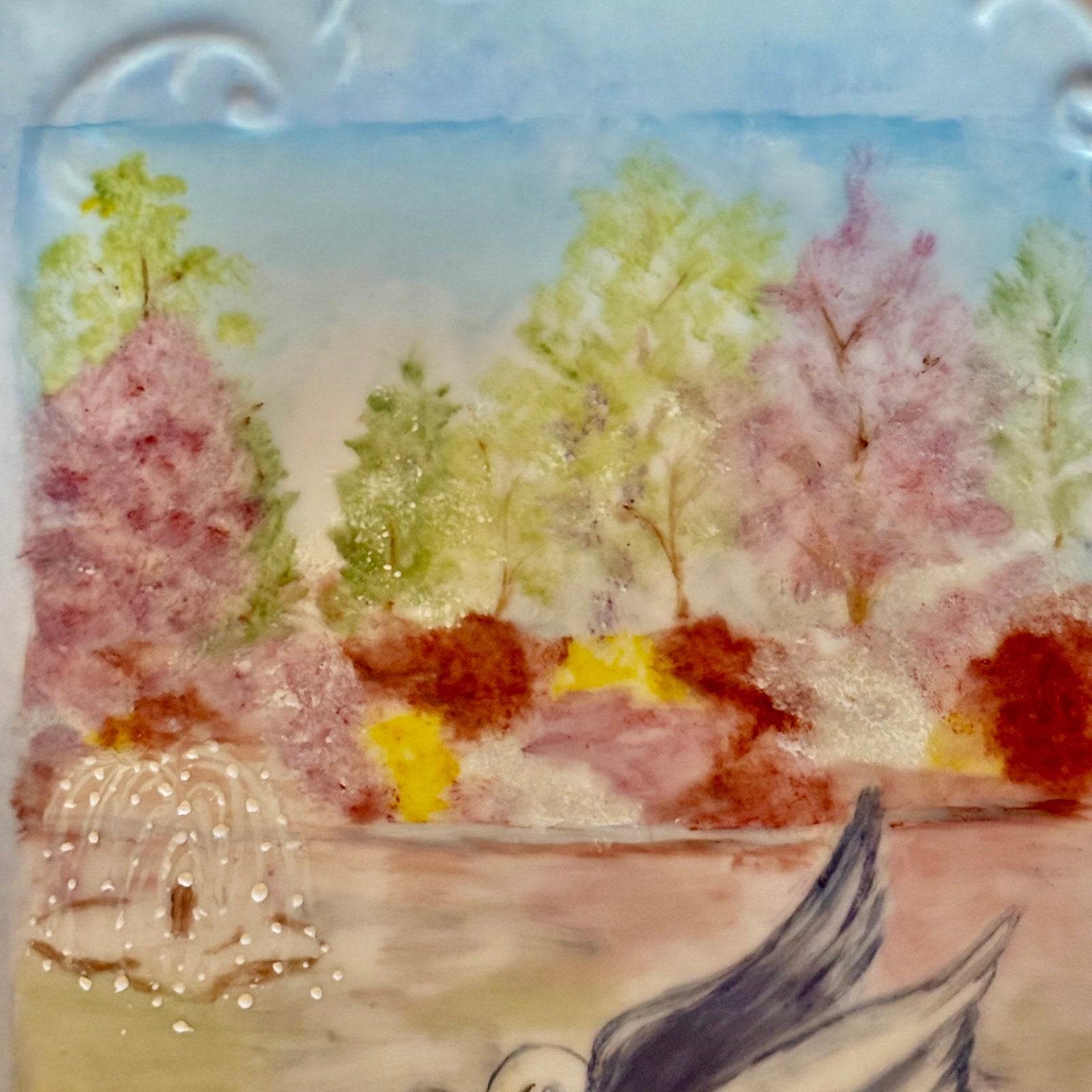 Beautiful hand-painted decorative plate featuring two swans on a lake with spring landscape. Soft pastel colors with scalloped edges. Artist signed Ruth E. Fox, Cheyenne, Wyoming.