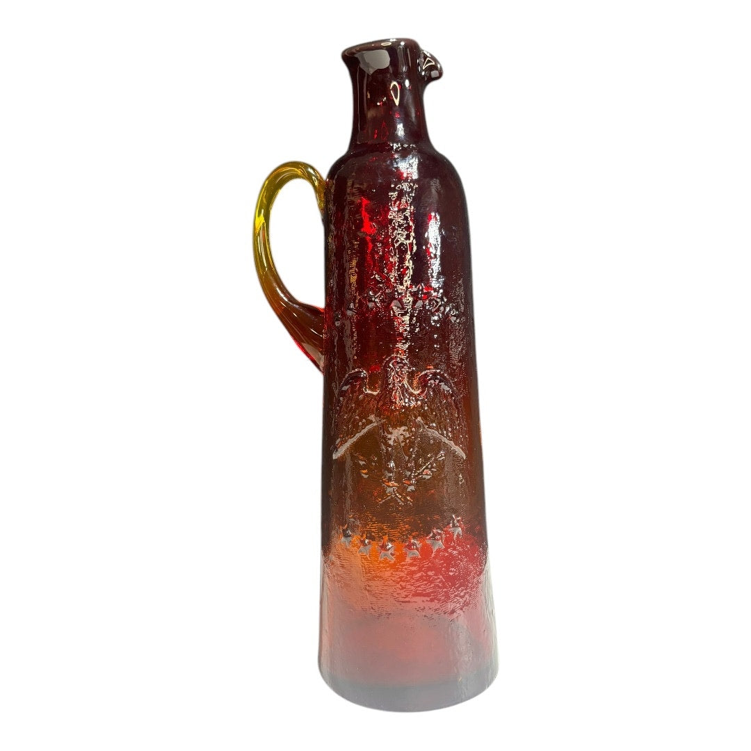 Vintage Kanawha glass pitcher in amberina with eagle star design. Vibrant red hue with cool eagle motif makes a striking decorative piece.
