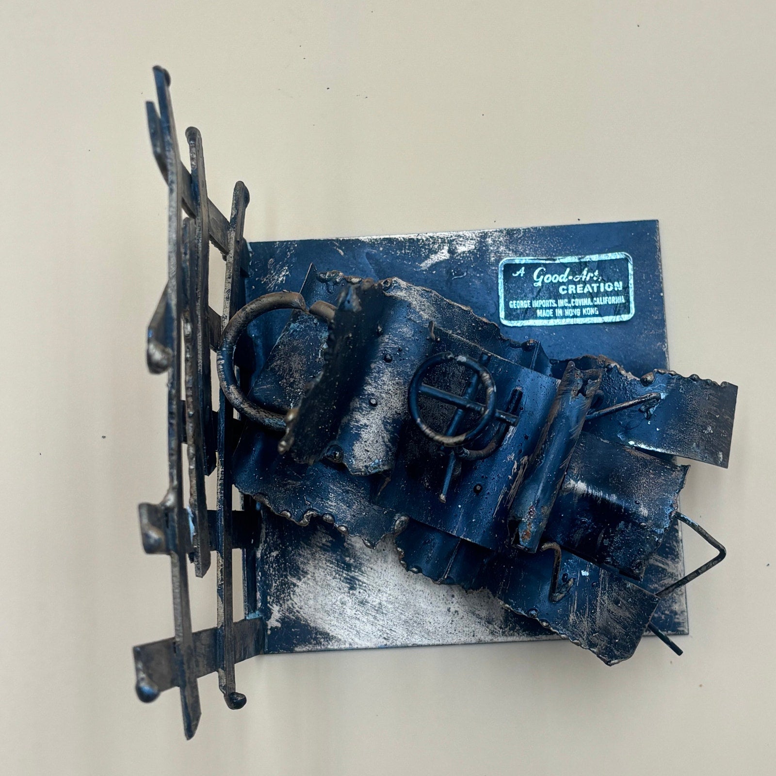 Vintage pair of metal bookends found together featuring a covered wagon and vintage car design. Each piece includes rustic fence backdrop. Good-Art Creation sticker found on one piece. Metal tones vary slightly between the two pieces. Each mounted on square base with dimensional design.