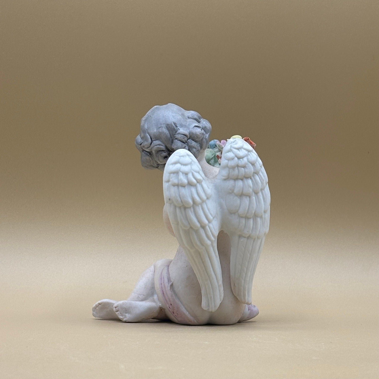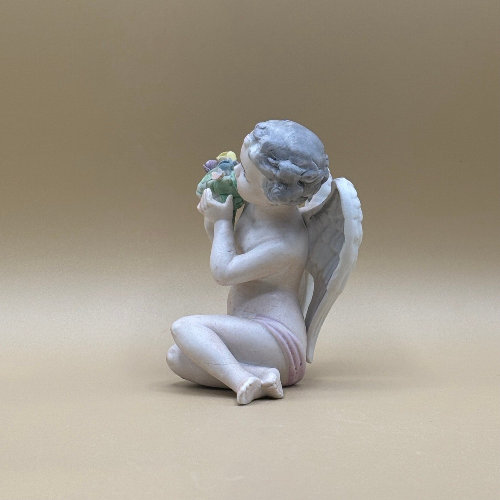 Sweet sitting cherub figurine by Norleans Japan. Features delicate hand-painted floral bouquet and pale lavender sash. Beautifully detailed porcelain with soft pastel colors.