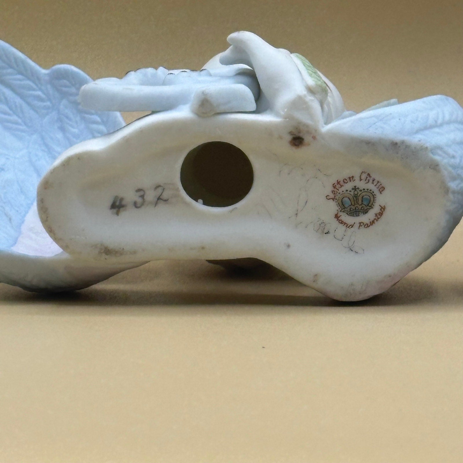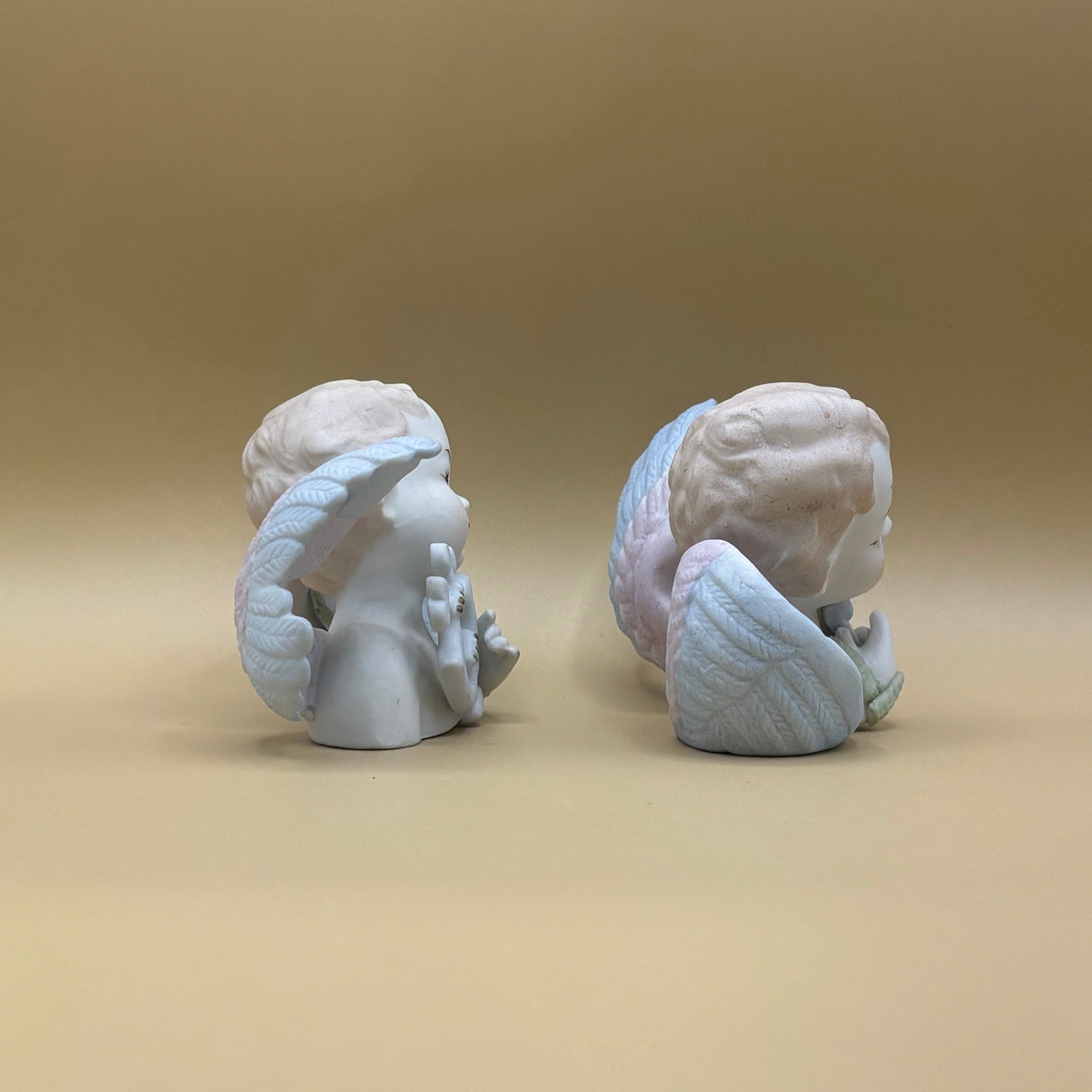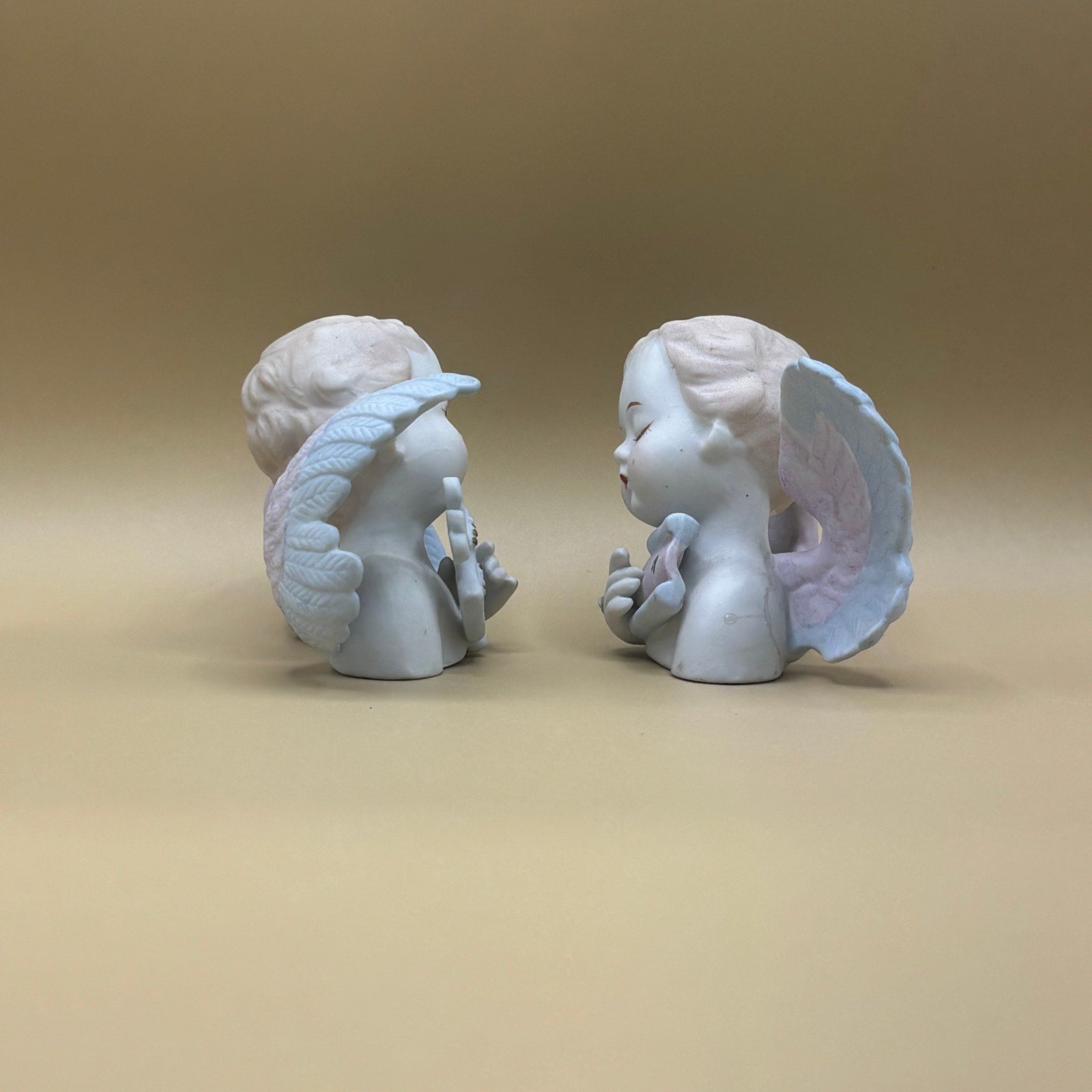 Sweet pair of porcelain angel busts with delicate wings and pastel floral details. One playing flute, one reading music. Hand-painted bisque finish with soft blue accents. Made in Occupied Japan. Number 432 and Lamore China marked on bottom.