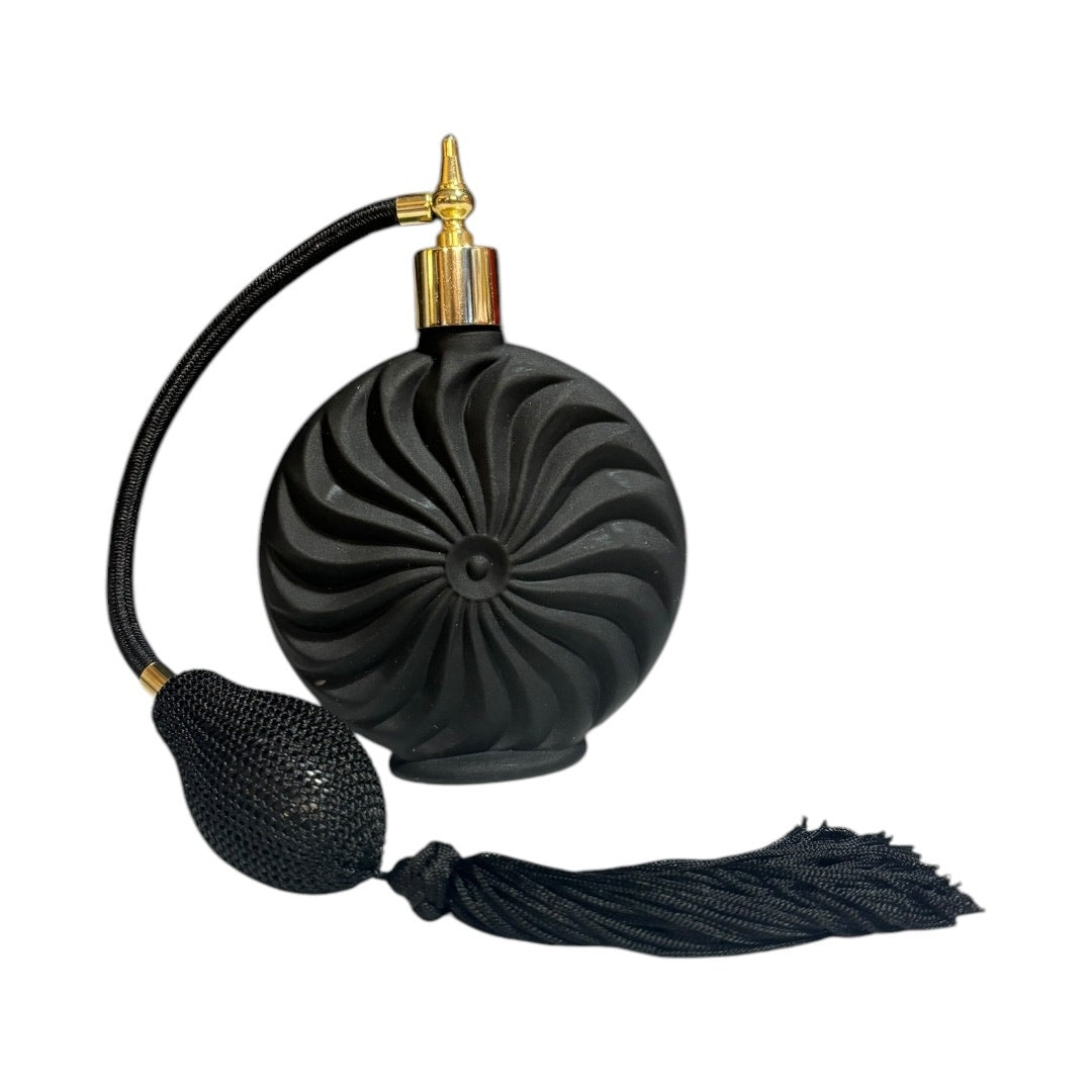 Vintage 1980s black satin glass perfume atomizer with Art Deco styling. Fully functional with elegant design. Perfect vanity accessory.