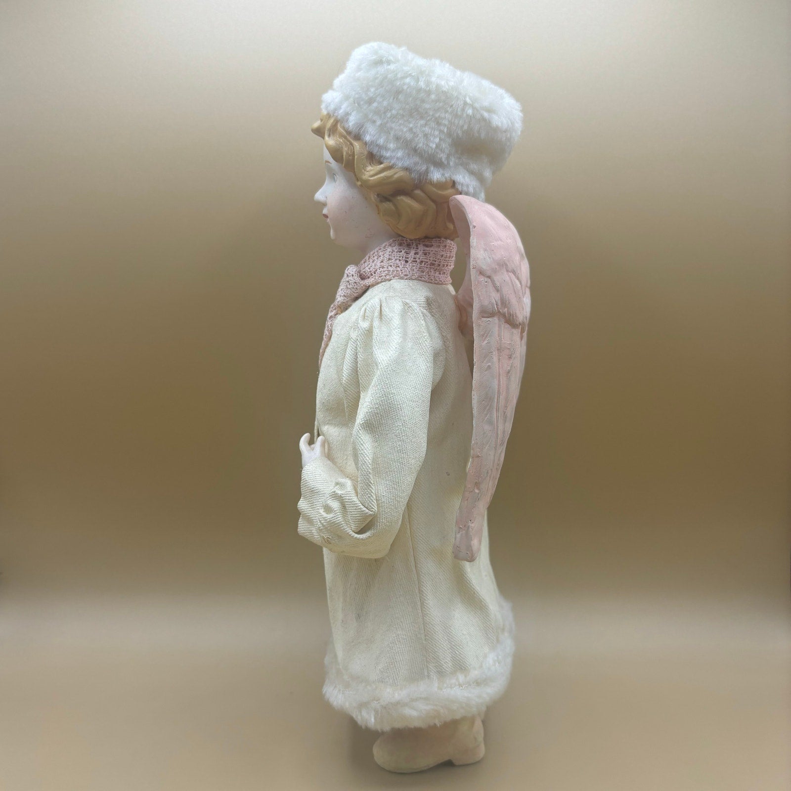 Charming winter doll by RUSS featuring cream colored winter coat with faux fur trim. Pink knit scarf and white furry winter hat complement her curly honey blonde hair and blue eyes. Holding small Christmas wreath with red berries and white bow. Made in Philippines.