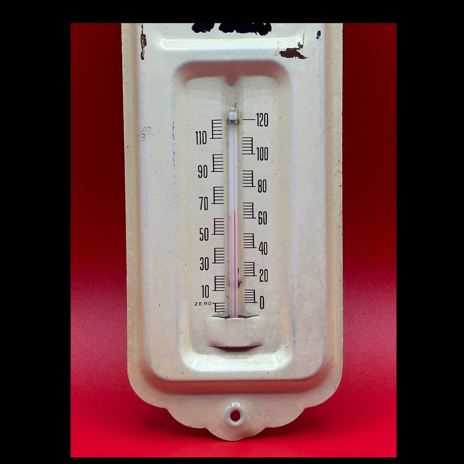 Brown metal thermometer featuring a Scottie dog design. Temperature reading may vary by a few degrees. Shows rustic character with some rust and fading.
