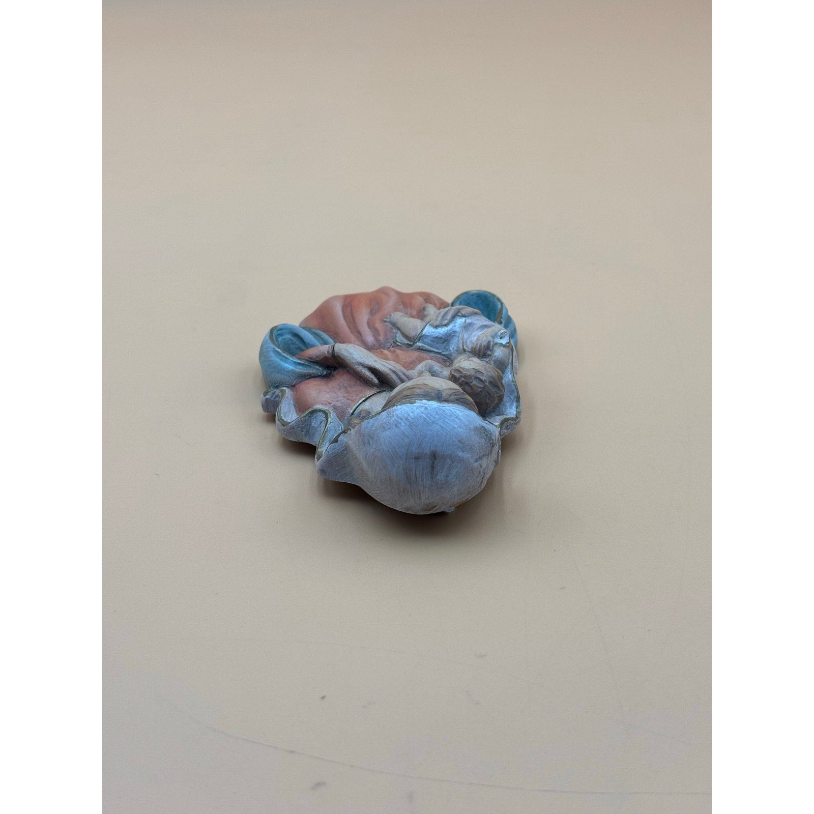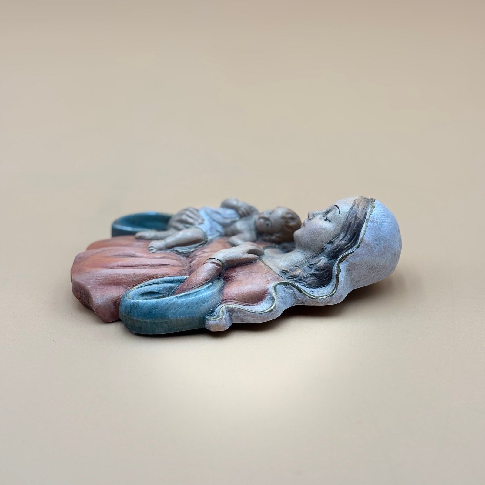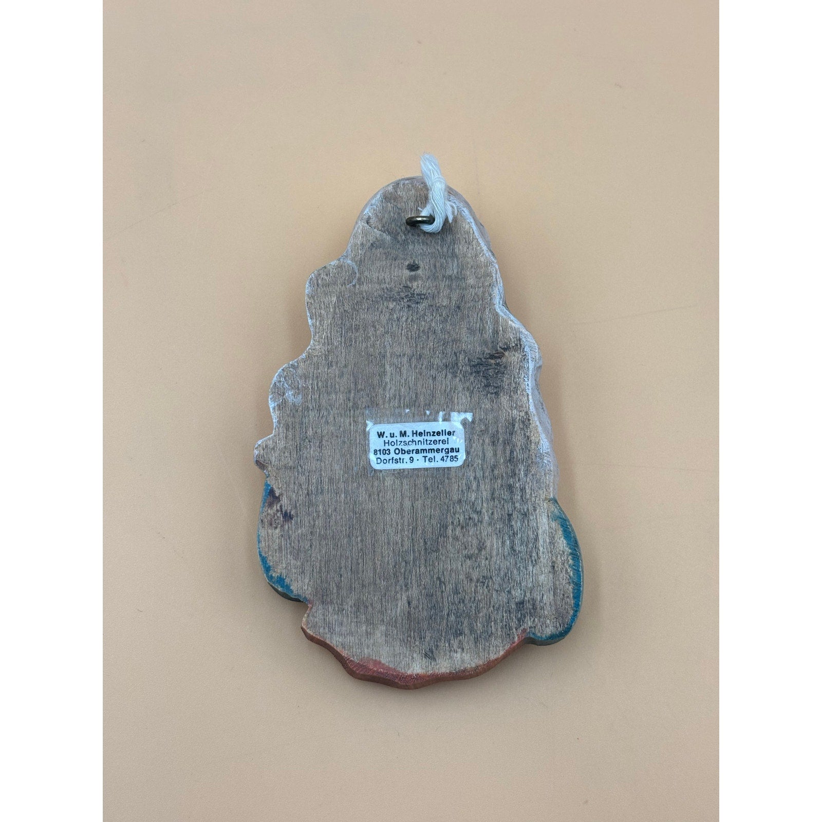 Hand-carved and painted wood Madonna and Child wall plaque by W. u. M. Heinzelier Holzschnitzerei, Oberammergau, Germany. Finely detailed with warm natural tones and soft facial features. Retains the original label and hanging hook on back.