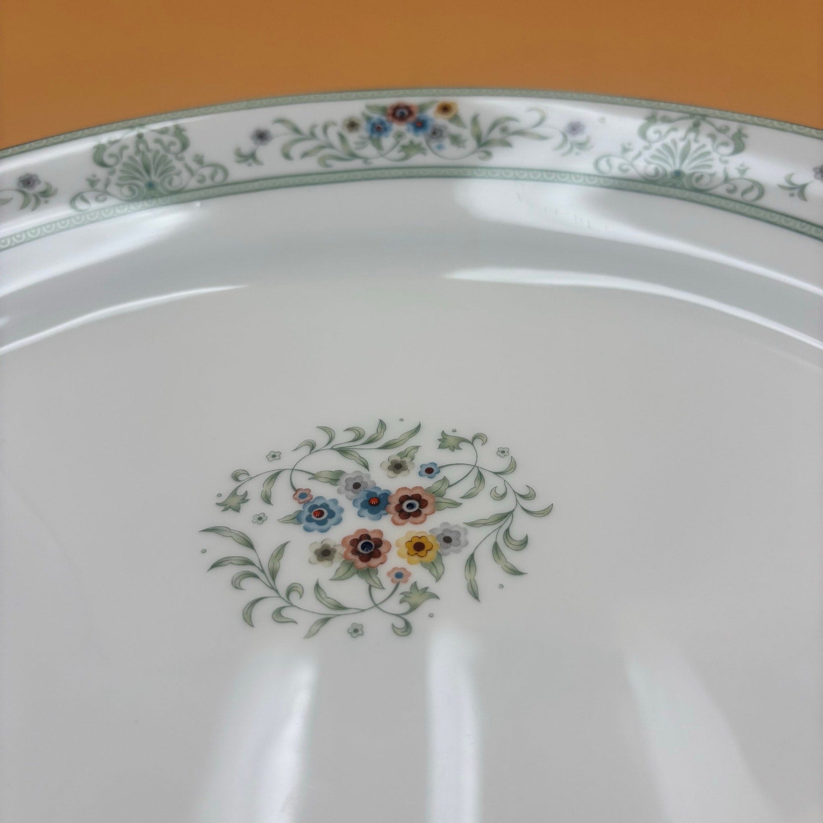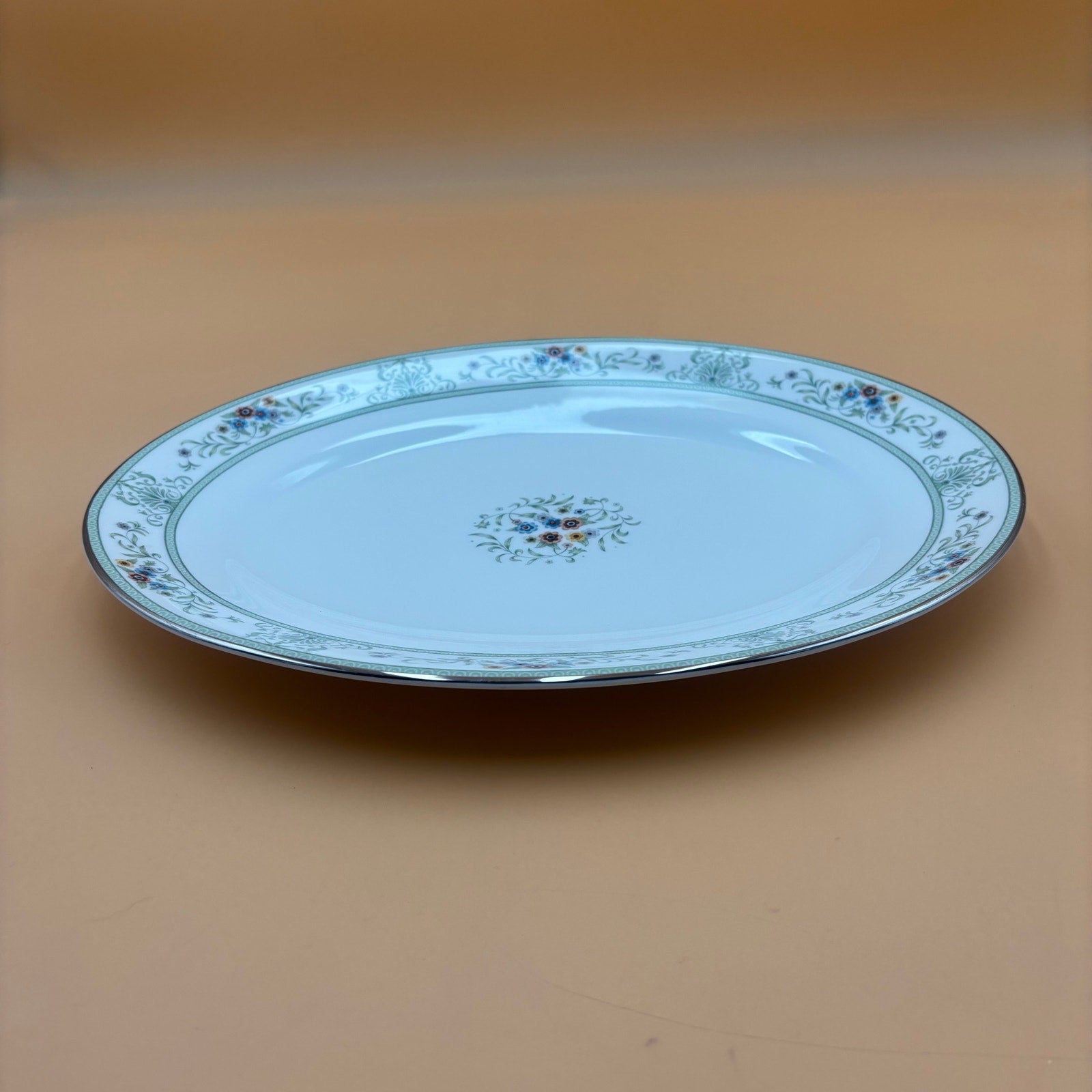 Wedgwood “Agincourt” R4471 bone china oval serving platter, made in England. Elegant green scroll border with multicolor floral bouquets and a platinum rim. Perfect for display or special occasions.