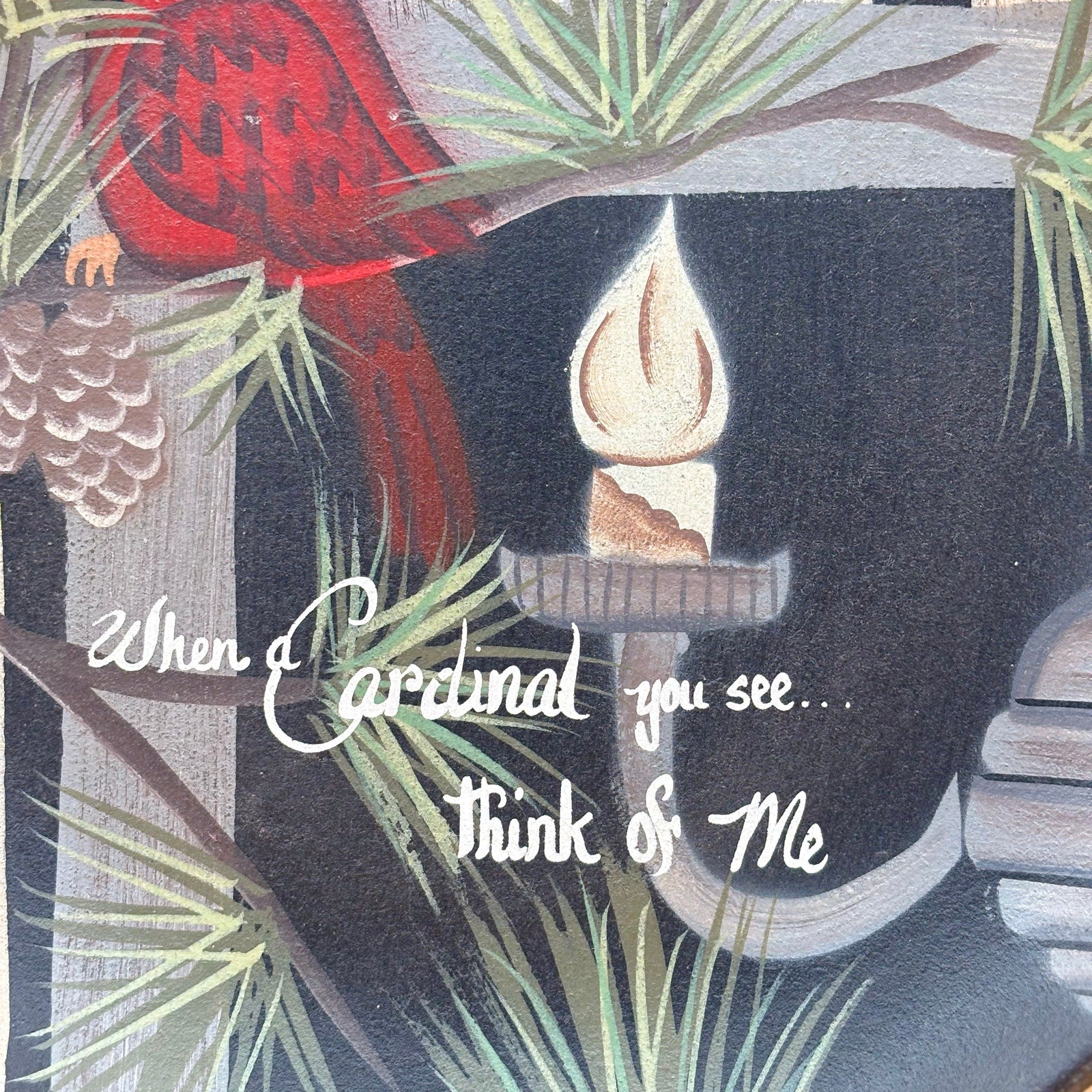 Beautiful hand-painted wooden plate from The Heartlands Collection, Inc. featuring a red cardinal, candle, and pine boughs with the message: “When a Cardinal you see… think of Me.” A warm and meaningful accent for memorial or holiday decor.