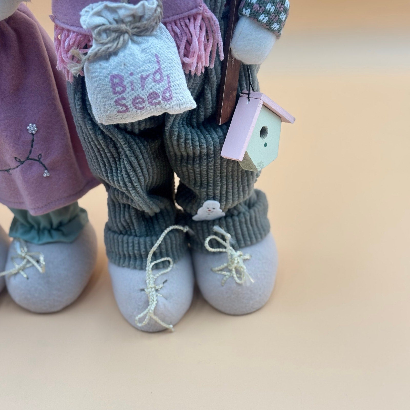 Adorable coordinating plush snowman couple perfect for winter and holiday decorating. Each figure is dressed in soft pastel clothing with charming details — one holding a “Bird Seed” bag and birdhouse, and the other cuddling a baby snowman. Crafted from fabric and felt with weighted bases for easy standing display.